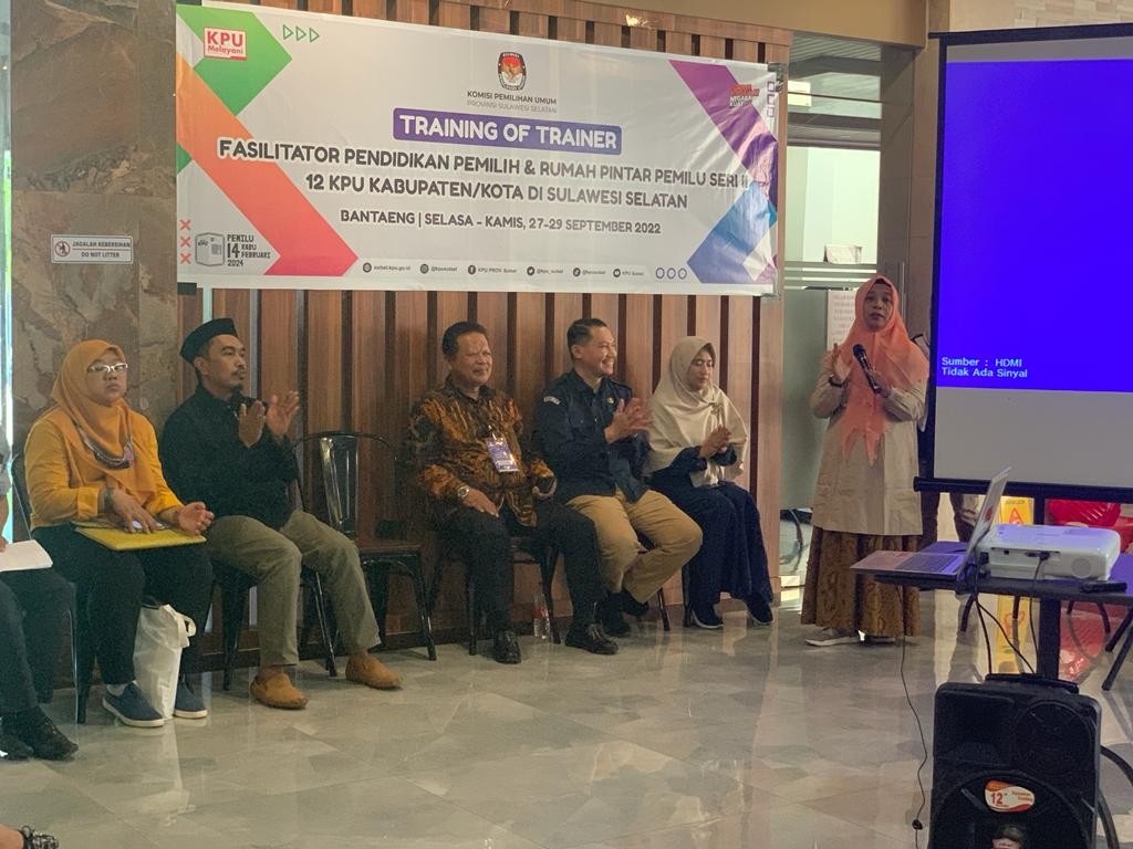 KPU.Sul.Sel,Bantaeng-Komisi Pemilihan Umum (KPU) Provinsi Sulawesi Selatan tidak henti-hentinya melakukan peningkatan Kompotensi Sumber Daya Manusia di Lingkup KPU Se-Sulawesi Selatan. Upaya tersebut dilakukan dengan melaksanakan kegiatan Training of Trainer Fasilitator Pendidikan Pemilih dan Rumah Pintar Pemilu Seri II yang sebelumnya seri I dilaksankan di Kota Palopo. Kegiatan ini dilaksanakan pada Hari Selasa (27/9/2022). Di Hotel Seruni Kabupaten Bantaeng. Ketua KPU Bantaeng Hamzar pada sambutannya sangat mengapresiasi kegiatan KPU Sulawesi Selatan yang dilaksanakan di Kabupaten Bantaeng. "Saya mengucapkan terima kasih dan mengapresiasi kegiatan yang dilaksanakan oleh KPU Sulawesi Selatan di kabupaten Bantaeng karena telah mempercayakan kabupaten Bantaeng menjadi tempat pelaksanaan kegiatan, saya juga berharap semoga kegiatan ini bisa mengedukasi kita dalam rangka penguatan edukasi kepemiluan yang nantinya akan kita lakukan di masyarakat."ungkapnya. Sementara itu Anggota KPU Sulawesi Selatan Divisi Sosialisasi, Pendidikan Pemilih dan Hubungan Partisipasi Masyarakat Misna M Hattas pada kegiatan tersebut mengatakan bahwa ToT untuk "TOT ini bertujuan untuk memperkuat kelembagaan dan meningkatkan kompetensi SDM di Lingkup KPU Se Sulawesi Selatan yang nantinya akan turun langsung melakukan edukasi kepada masyarakat." Lanjut misna juga mengatakan bahwa pendidikan pemilih yang dilakukan oleh KPU mempunyai dampak yang besar yang dapat merubah perilaku pemilih. "Kegiatan ini dilaksanakan karena memang sudah menjadi kebutuhan kita bersama, bahwa pendidikan pemilih yang dilakukan oleh KPU bisa di pastikan akan mempunyai dampak yang besar, yang bisa merubah perilaku masyarakat atau pemilih yang bisa mempraktekkan nilai nilai yang baik dalam berpemilu."ungkapnya Kegiatan ini berlangsung selama tiga hari dimulai dari tanggal 27 sampai dengan 29 September 2022. dengan peserta yang berasal dari masing-masing Anggota KPU Divisi Sosialisasi dan pendidikan pemilih, dan Staf Sub Bagian Teknis dan Hubungan Partisipasi Masyarakat 12 KPU Kabupaten Dan Kota yaitu Kabupaten Pangkep, Barru, Maros, Bone Bantaeng, Bulukumba, Kep. Selayar, Jeneponto, Takalar, Gowa dan Kota Makassar.(aam)