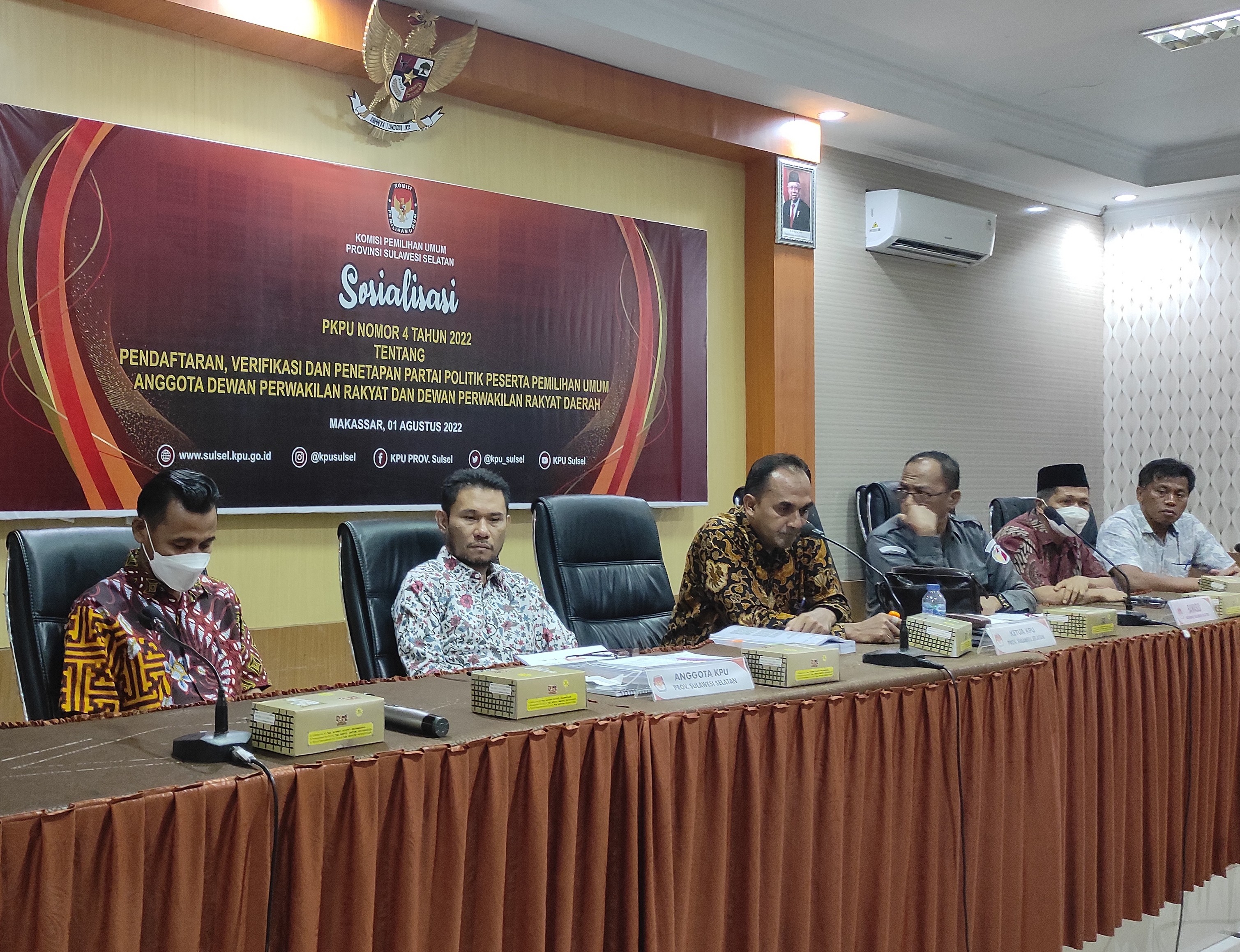 Makassar,KPU.SulSel.-Komisi Pemiliham Umum (KPU) Provinsi Sulawesi Selatan melaksanakan kegiatan Sosialisasi Peraturan Komisi Pemilihan Umum Nomor 4 Tahun 2022, Tentang Pendaftaran, Verifikasi, dan Penetapan Partai Politik Peserta Pemilihan Umum Anggota Dewan Perwakilan Rakyat dan Dewan Perwakilan Rakyat Daerah. Senin, (1/8/2022) di Aula Kantor KPU Sulawesi Selatan. Ketua KPU Provinsi Sulawesi Selatan Faisal amir Dalam sambutannya pada kegiatan sosialisasi tersebut mengatakan pendaftaran partai politik sudah dimulai di KPU Republik Indonesia dan KPU Sulsel juga saat ini sudah membentuk Help Desk Tahapan Verifikasi Partai Politik "Hari ini adalah hari Senin 1 Agustus 2022, adalah hari pertama pendaftaran partai politik yang dijadwal mulai tanggal 1 sampai 14 Agustus di KPU Republik Indonesia, disamping itu juga kami sudah membentuk help desk untuk melakukan koordinasi dan komunikasi kepada partai politik calon peserta pemilu terkait Tahapan verifikasi Partai politik."katanya Lanjut M. Asram Jaya juga memberikan penjelasan tentang fungsi helpdesk yang ada di KPU Sulawesi Selatan dan berharap kepada partai politik agar menginformasikan kepada KPU Sulawesi Selatan kalau ada petugas penghubung partai politik berganti. "Helpdesk adalah media untuk Bapak dan ibu calon peserta pemilu untuk berkoordinasi dan berkomunikasi tentang verifikasi partai politik, dan memungkinkan partai politik menugaskan satu atau dua orang dengan surat tugas dari partai. Lanjut asram "Dan kalaupun misalnya petugas dari partai politik yang berhubungan dengan help desk KPU Sulawesi Selatan digantikan oleh partai politik mohon dikoordinasikan secepatnya agar bentuk komunikasi atau koordinasi yang kami bangun dengan partai politik tidak putus."jelasnya. Selain itu asram juga menyinggung regulasi dan dasar hukum yang mengatur tentang Tahapan, Pendaftaran, Verifikasi Partai politik dan Penetapan Partai politik Calon Peserta Pemilu Tahun 2024. "Menyangkut aturan pendaftaran dan verifikasi serta penetapan partai politik sesuai dengan Peraturan Komisi Pemilihan Umum Nomor 4 tahun 2022 dan Undang Undang Nomor 7 tahun 2017 serta putusan mahkamah konstitusi Nomor 55 tahun 2020."ungkapnya Diakhir kegiatan, Ketua Badan Pengawas Pemilihan Umum (Bawaslu) Provinsi Sulawesi Selatan Laode Arumahi mengatakan tugas bawaslu adalah mengawasi proses tahapan pemilu dan menerima permohonan sengketa. "Salah satu tugas Bawaslu adalah mengawasi kegiatan sosialisasi KPU dan kami datang selain menghadiri kegiatan kami juga melaksanakan Tugas pengawasan, kami juga dibawaslu melakukan langkah langkah persiapan mulai dari pembentukan tim Yang akan bertugas 1 kali 24 jam. dan tim ini akan melaksanakan Tugas Bawaslu terutama menerima permohonan sengketa ketika nanti ada sengketa antara KPU dengan Peserta Partai Politik maka mekanismenya silahkan bermohon di Bawaslu kami akan melakukan penanganan sesuai dengan kewenangan Bawaslu. Jelasnya Diketahui juga Saat ini Jumlah Partai Politik yang sudah memiliki akun Sistem Informasi Partai Politik per tanggal 29 Juli 2022 pukul 13.00 WIB yaitu sebanyak 39 (tiga puluh sembilan) Partai Politik Nasional dan 8 (delapan) Partai Politik Lokal Aceh.(a*m)