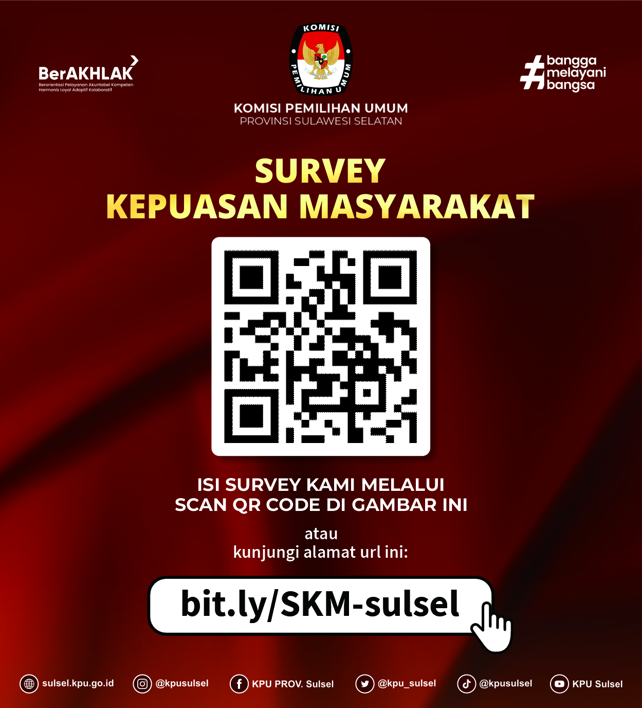 KPU Provinsi Sulawesi Selatan melakukan evaluasi terhadap pelayanan publik yang dilaksanakan pada Unit Layanan KPU Provinsi Sulawesi Selatan melalui Kuesioner Survei Kepuasan Masyarakat (SKM) bagi masyarakat/publik yang dapat diakses melalui LINK KUESIONER SURVEI KEPUASAN MASYARAKAT (SKM)
